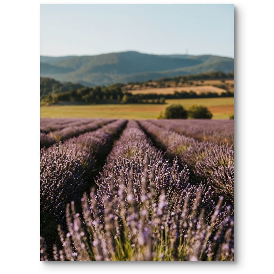 Ten plakat to zachwycający widok rozciągających się po horyzont pól lawendy, tonących w fioletach i otoczonych łagodnymi wzgórzami. Kadr został uchwycony z niezwykłą wrażliwością na piękno przyrody oraz atmosferę błogiego spokoju wiejskiego krajobrazu. Każda linia i każdy detal oddają esencję relaksu i harmonii z naturą.
