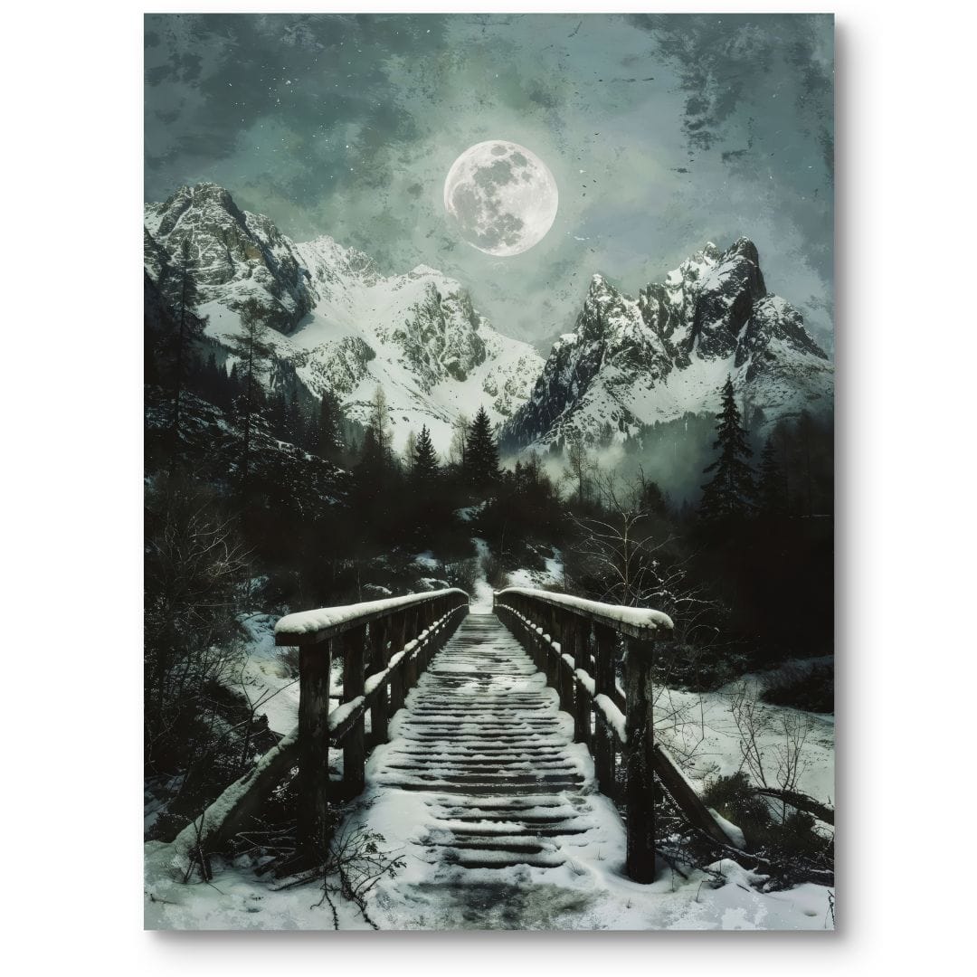 Plakat ukazuje niezwykły, zimowy krajobraz z malowniczym drewnianym mostem, prowadzącym wprost ku majestatycznym szczytom gór, rozświetlonym srebrzystym blaskiem księżyca w pełni. Most przecina cichy, pokryty śniegiem las, nadając całości aurę tajemniczości i niemal mistycznego spokoju.