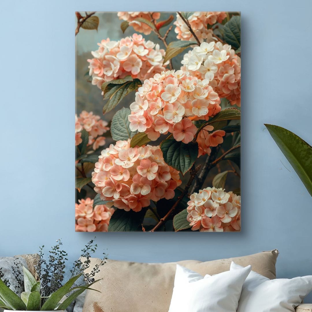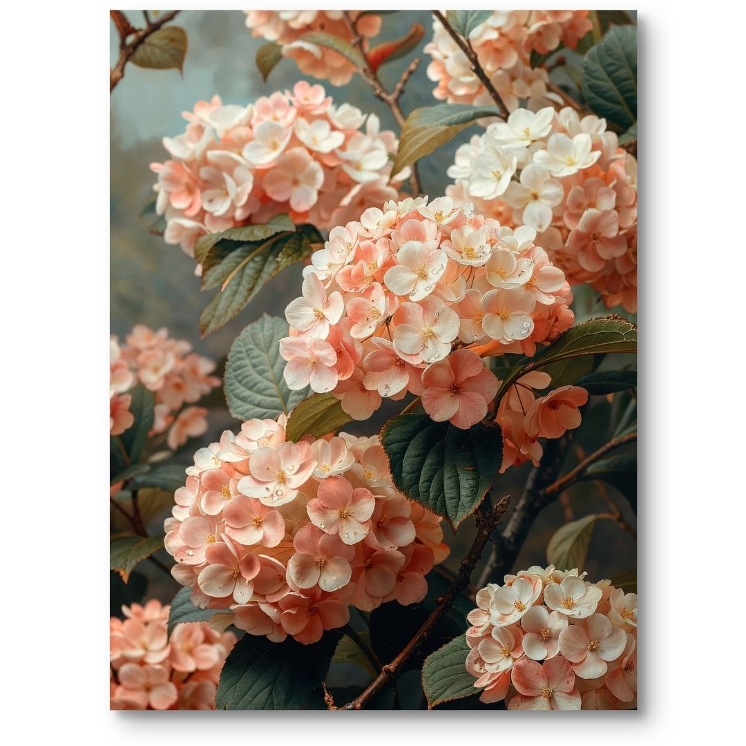 Ten elegancki plakat prezentuje hortensje w pełni rozkwitu, ukazane w zbliżeniu makro, które pozwoliło uchwycić nawet najdrobniejsze szczegóły kwiatowych płatków oraz soczystych liści. Subtelne odcienie różu i bieli harmonijnie współgrają ze świeżą zielenią, tworząc kompozycję przepełnioną naturalnym wdziękiem. To obraz spokoju i piękna natury, który z łatwością przyciąga wzrok i buduje atmosferę wyciszenia.