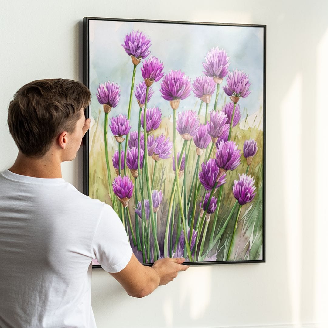 Ten plakat ukazuje bukiet czosnku ozdobnego (Allium) rozkwitający w naturalnym otoczeniu. Kuliste kwiatostany czosnku, przyciągające wzrok swoją niezwykłą formą, wyróżniają się na tle łagodnych odcieni zieleni oraz beżu. Projekt celebruje autentyczne piękno roślin, czyniąc go doskonałą propozycją dla osób zafascynowanych botanicznymi motywami i malarstwem inspirowanym naturą.