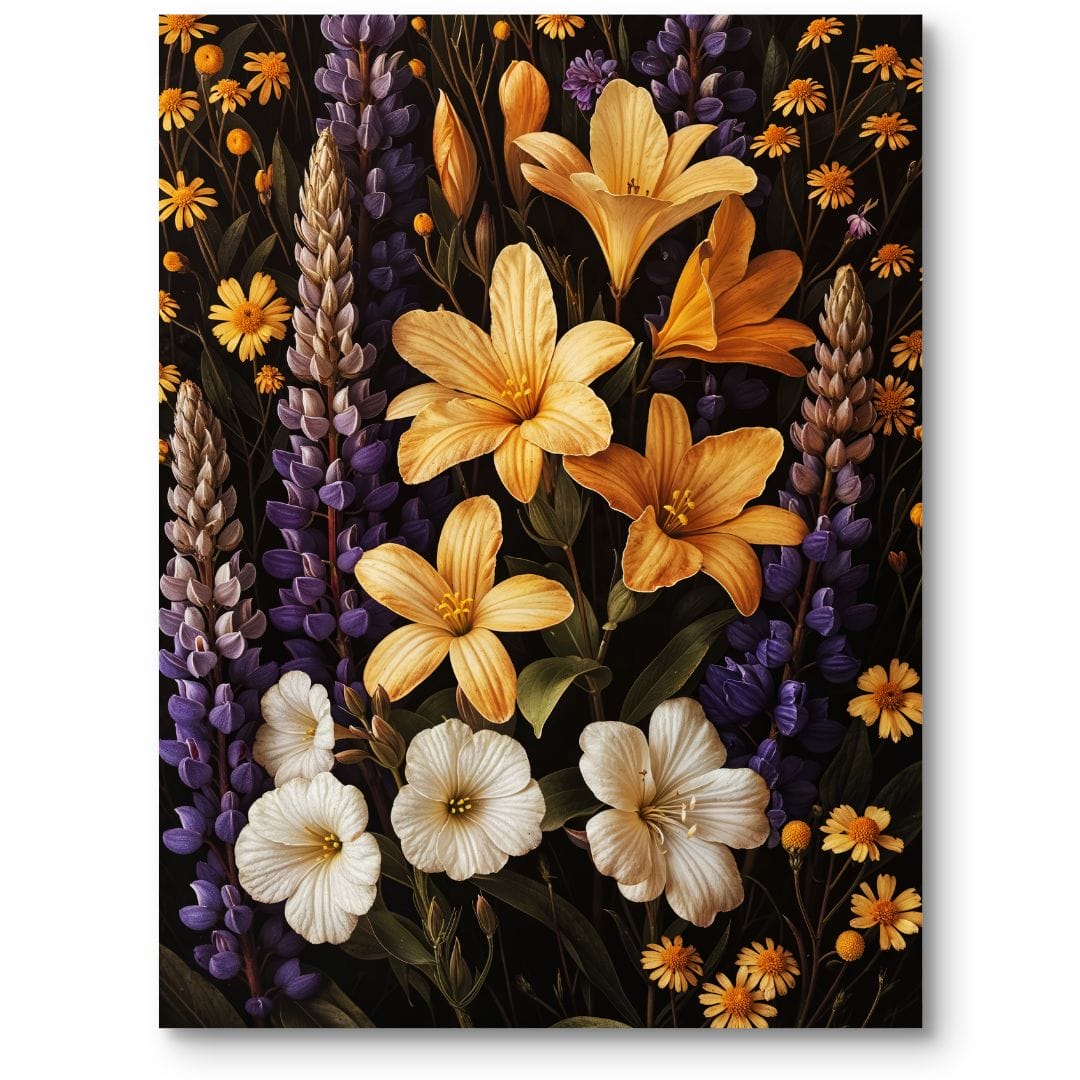 Plakat prezentuje niezwykle malowniczą kompozycję kwiatów w ich naturalnym środowisku. Wśród gąszczu roślin wyróżniają się żółte lilie, fioletowe oraz białe kwiaty, tworząc jednocześnie harmonijną i szczegółową mozaikę form oraz kolorów. To prawdziwa uczta wizualna dla każdego miłośnika przyrody i kwiatowych motywów.
