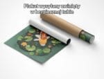 Centralne miejsce na plakacie zajmuje ryba koi otoczona miękko układającymi się lilami wodnymi i lotosami. Okrągłe formy roślin tworzą wrażenie płynności oraz ruchu, kierując wzrok ku głównemu motywowi. Harmonijne zestawienie zieleni, pomarańczy i bieli zapewnia świeżość oraz naturalistyczny charakter aranżacji. Uważnie rozmieszczone akcenty kolorystyczne podkreślają detal oraz dynamikę kompozycji.