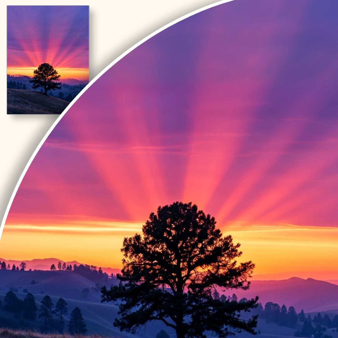Wyważona kompozycja z centralnie umieszczonym drzewem przyciąga wzrok i nadaje całości unikatowej równowagi. Rozproszone promienie słoneczne nadają dynamiki, a wyraziste, ciepłe barwy nieba – fiolet, pomarańcz i róż – idealnie kontrastują z ciemnymi sylwetkami wzgórz, tworząc harmonijny, estetyczny efekt wizualny.