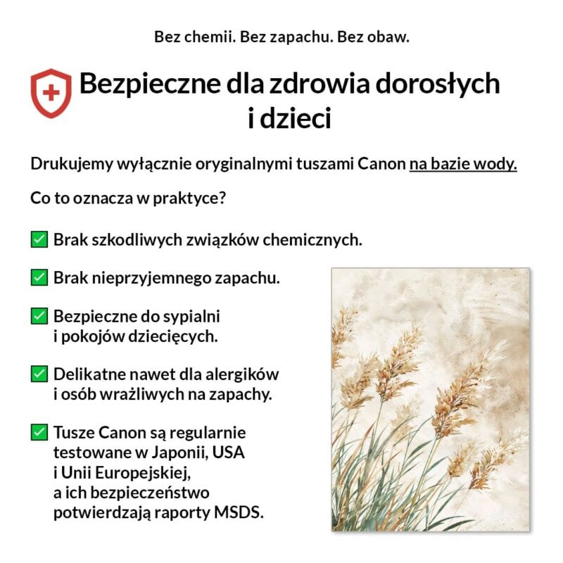 Tak, absolutnie! Drukujemy wyłącznie certyfikowanymi, bezwonnymi tuszami pigmentowymi Canon Lucia Pro na bazie wody. Są one w pełni bezpieczne dla zdrowia, nie zawierają rozpuszczalników i mogą być bez obaw stosowane w sypialniach i pokojach dziecięcych.