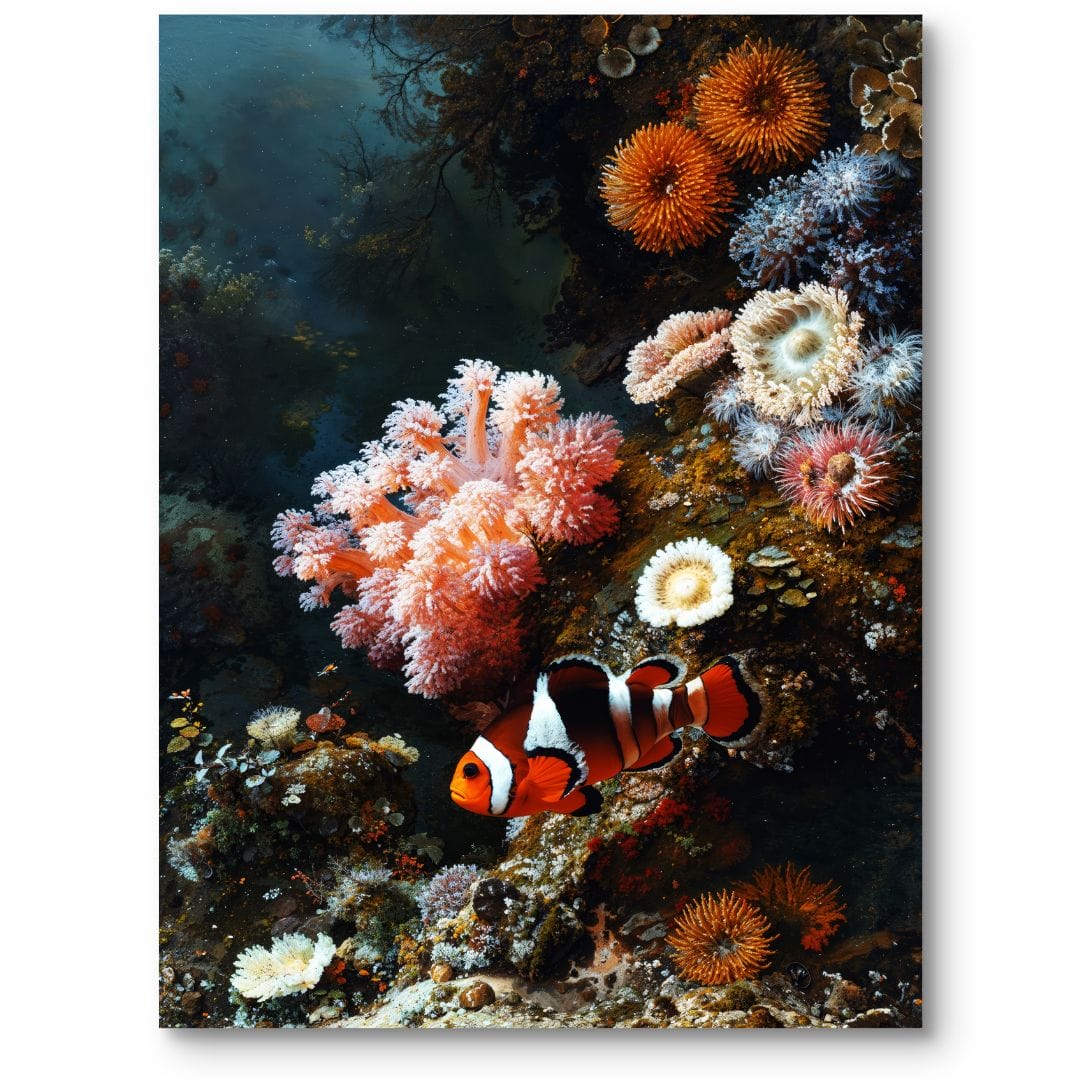Prezentowany plakat wciąga widza w magiczny świat podwodnych głębin, ukazując niezwykle realistyczną scenę na rafie koralowej. Centralnym punktem kompozycji jest uroczy błazenek, który swobodnie przepływa pośród barwnych koralowców i bogactwa życia morskiego. Ta wyjątkowa scena zachwyca różnorodnością oraz energią, oddając niepowtarzalne piękno oceanicznej natury.