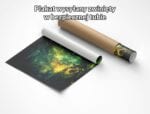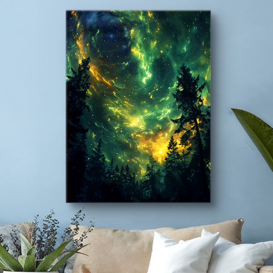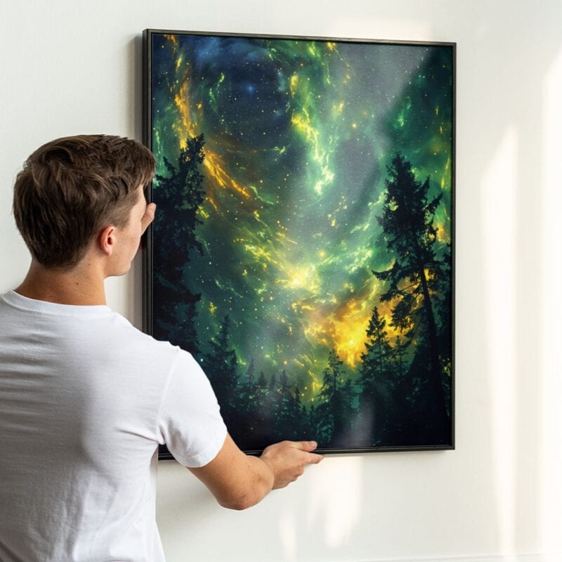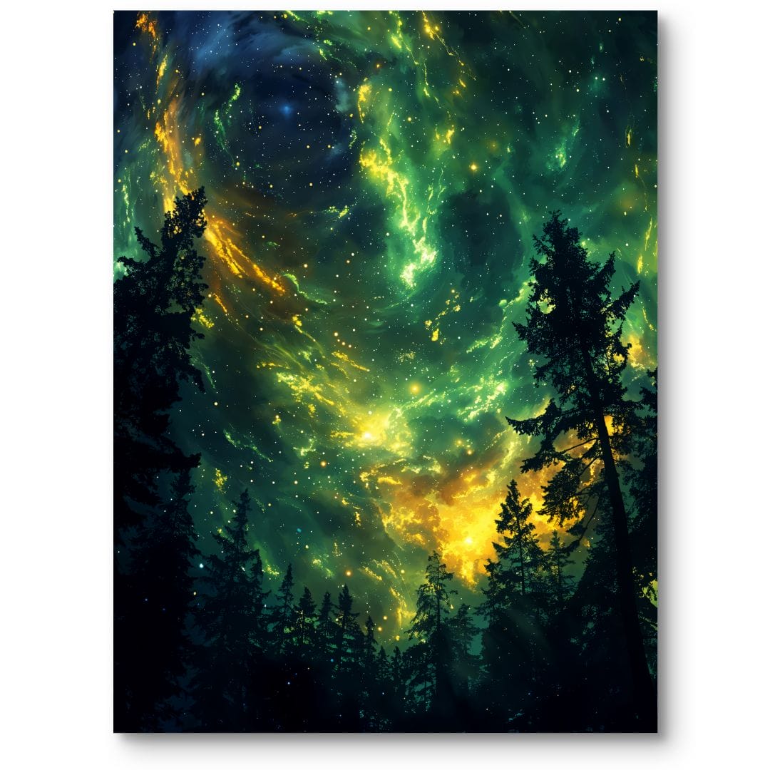 Ten wyjątkowy plakat przenosi nas w świat rozgwieżdżonego, nocnego nieba pełnego tajemnic i kolorowych mgławic, rozciągających się nad ciemnym, gęstym lasem. Patrząc na ten plakat, można poczuć się, jakbyśmy stali samotnie pośród drzew i podziwiali magiczny spektakl gwiazd oraz aurę zieleni i złota rozświetlającą nieboskłon.