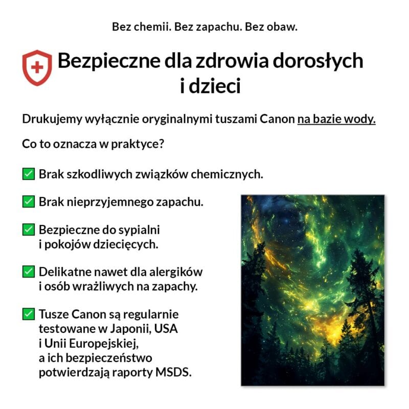 Tak, absolutnie! Drukujemy wyłącznie certyfikowanymi, bezwonnymi tuszami pigmentowymi Canon Lucia Pro na bazie wody. Są one w pełni bezpieczne dla zdrowia, nie zawierają rozpuszczalników i mogą być bez obaw stosowane w sypialniach i pokojach dziecięcych.
