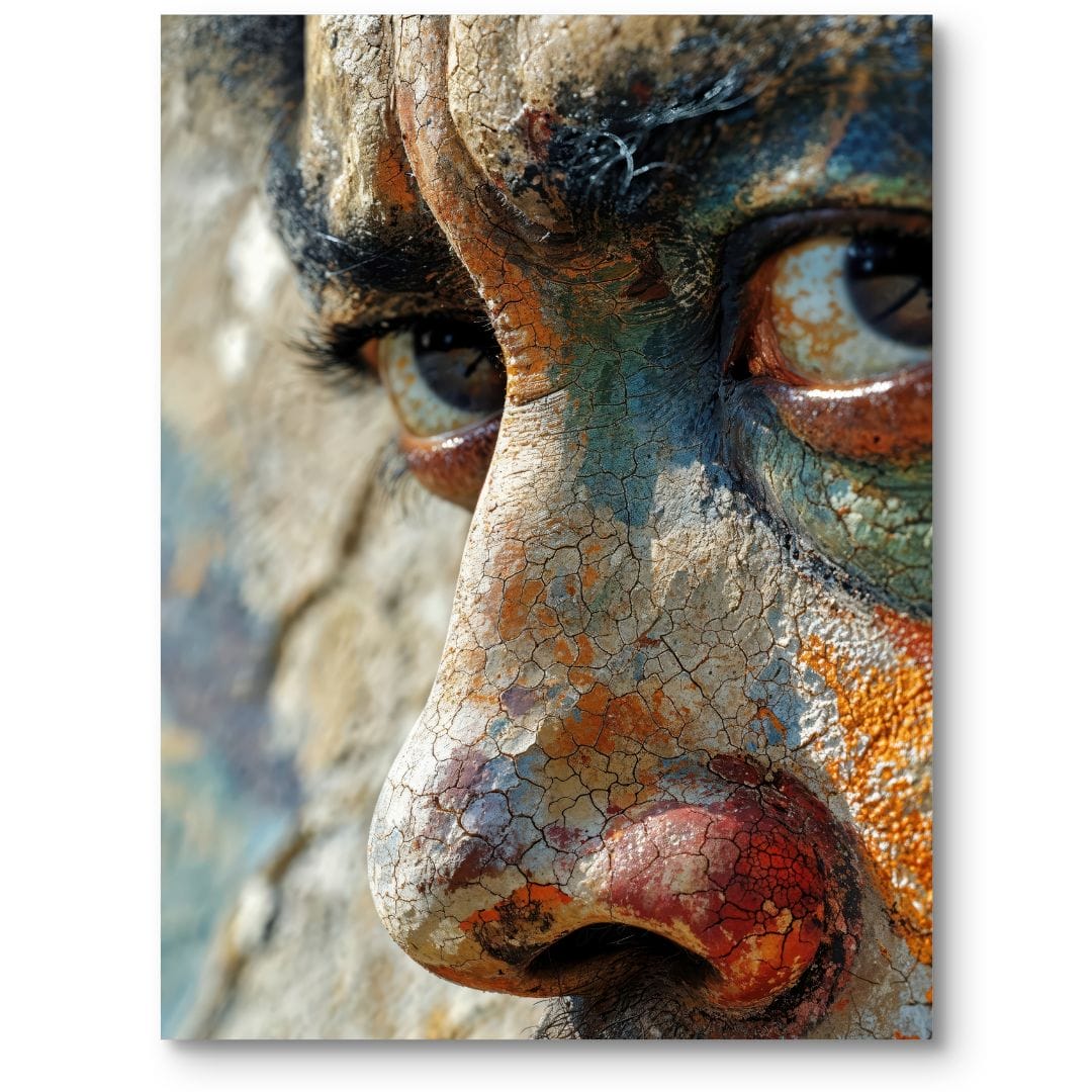 Ten intrygujący plakat ukazuje fascynujące zbliżenie centralnej części twarzy, skupiając uwagę na oczach i nosie. Dzięki wykorzystaniu techniki makrofotografii, każdy detal skóry staje się prawdziwą ozdobą, wydobywając wyjątkowy charakter i głębię obrazu.