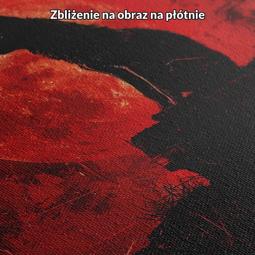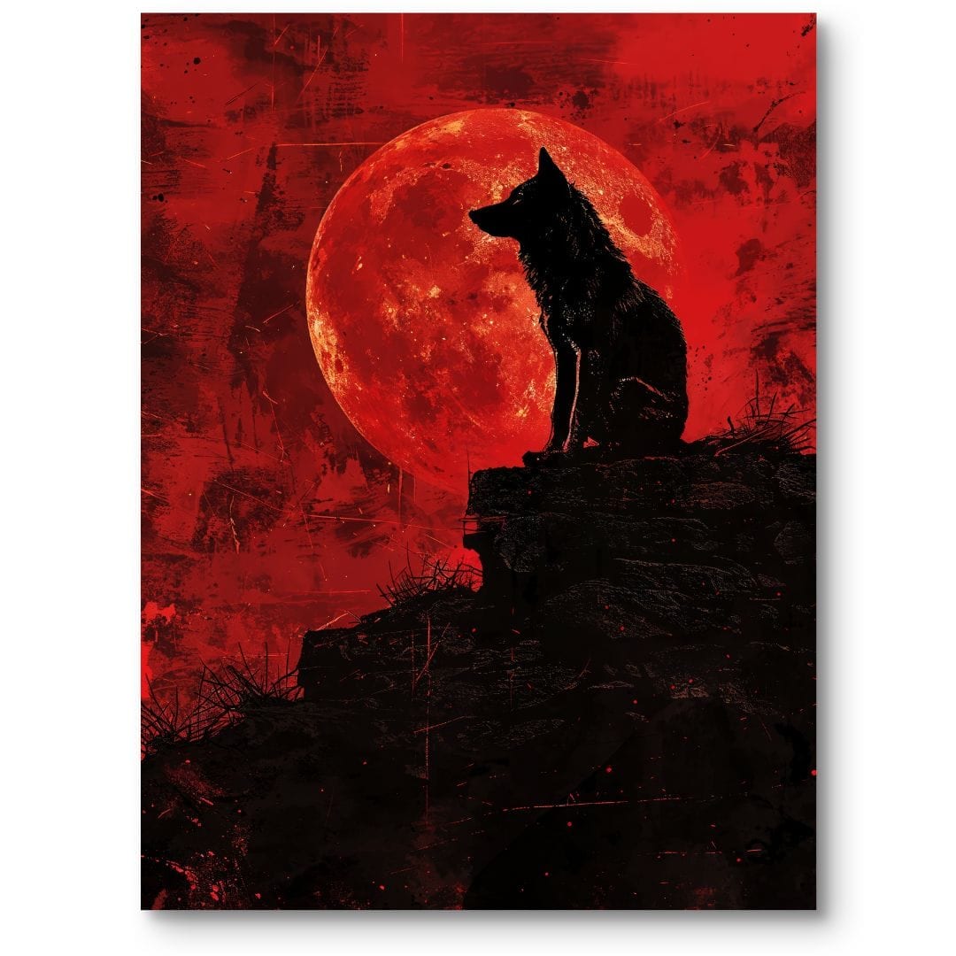 Plakat ukazuje wyjątkową scenę z wilkiem spoczywającym na wzgórzu podczas mrocznej, księżycowej nocy. Potężny księżyc w pełni dominuje w tle, otulając całość intensywną czerwienią, która buduje aurę tajemnicy i magii. Sylwetka wilka, ukazana w majestatycznej pozie, emanuje siłą i dzikością, przenosząc widza w sam środek nieokiełznanej natury.