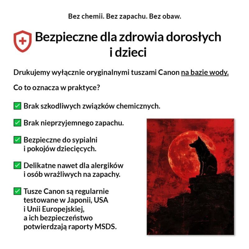 Tak, absolutnie! Drukujemy wyłącznie certyfikowanymi, bezwonnymi tuszami pigmentowymi Canon Lucia Pro na bazie wody. Są one w pełni bezpieczne dla zdrowia, nie zawierają rozpuszczalników i mogą być bez obaw stosowane w sypialniach i pokojach dziecięcych.