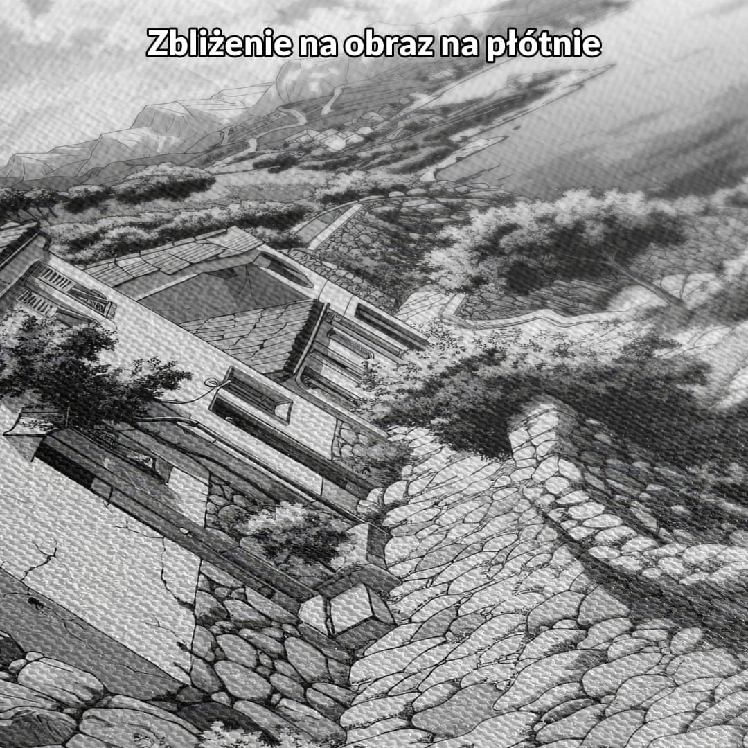 Harmonijnie poprowadzone kamienne ścieżki kierują spojrzenie ku spokojnemu morzu w tle. Miękkie światło wpada z górnej lewej strony, nadając scenie lekkości i trójwymiarowości. Monochromatyczna paleta barw – czerni, bieli i szarości – nadaje plakatowi ponadczasowej elegancji i wyciszenia.