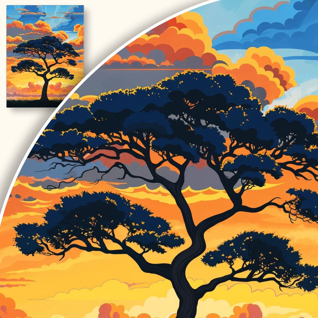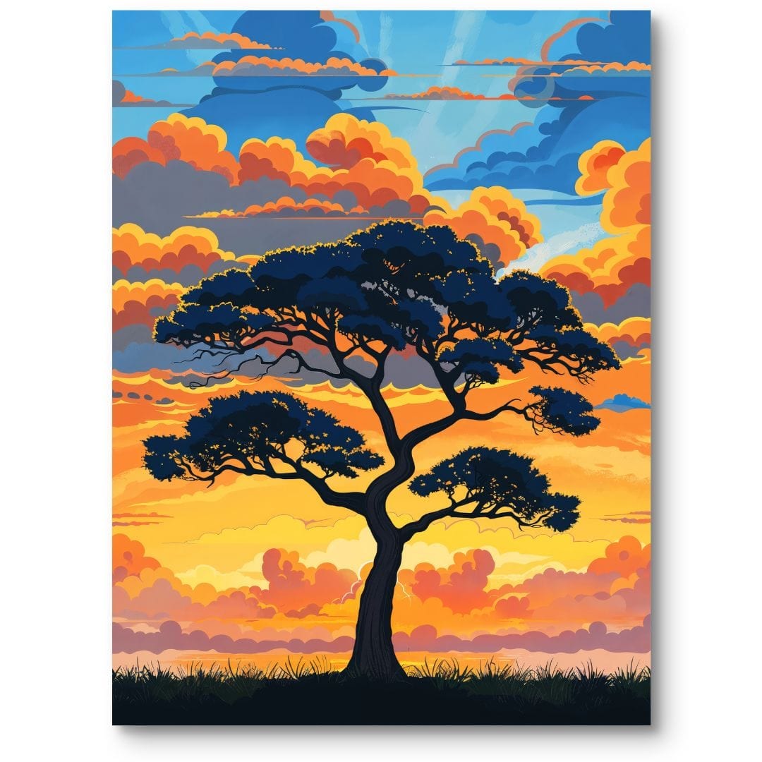 Nowoczesny charakter plakatu łączy minimalizm z ekspresją barw, dzięki cyfrowej technice graficznej. Wyraziste kontury drzewa oraz nasycone odcienie nieba nadają kompozycji głębi i dynamizmu. Taki styl sprawia, że plakat idealnie odnajdzie się zarówno w minimalistycznych, jak i bardziej eklektycznych wnętrzach.