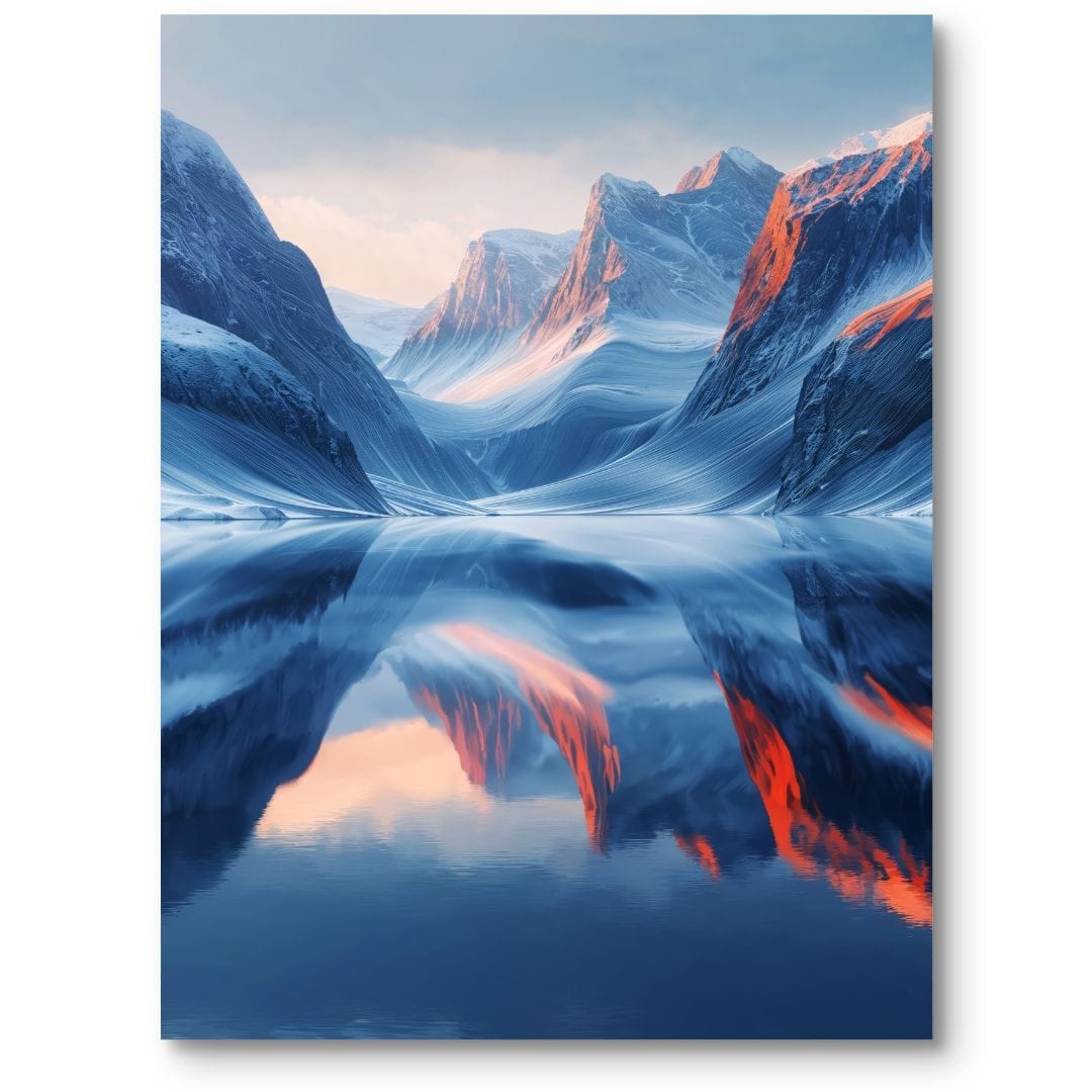Prezentowany plakat ukazuje zachwycający zimowy pejzaż górski, gdzie majestatyczne, pokryte śniegiem szczyty dominują nad krajobrazem. W centralnej części kompozycji znajduje się spokojne jezioro, w którym niczym w lustrze malowniczo odbijają się góry. Całość otula subtelne, pomarańczowe światło wschodzącego słońca, wprowadzając do sceny nutę romantyzmu i wyciszenia. To doskonała propozycja dla miłośników natury oraz entuzjastów górskich wędrówek.