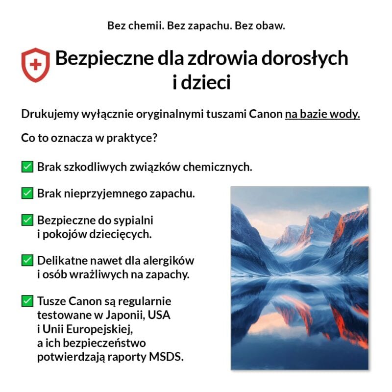 Tak, absolutnie! Drukujemy wyłącznie certyfikowanymi, bezwonnymi tuszami pigmentowymi Canon Lucia Pro na bazie wody. Są one w pełni bezpieczne dla zdrowia, nie zawierają rozpuszczalników i mogą być bez obaw stosowane w sypialniach i pokojach dziecięcych.