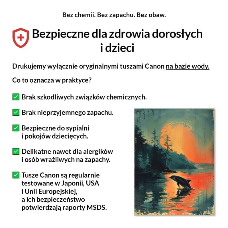Tak, absolutnie! Drukujemy wyłącznie certyfikowanymi, bezwonnymi tuszami pigmentowymi Canon Lucia Pro na bazie wody. Są one w pełni bezpieczne dla zdrowia, nie zawierają rozpuszczalników i mogą być bez obaw stosowane w sypialniach i pokojach dziecięcych.