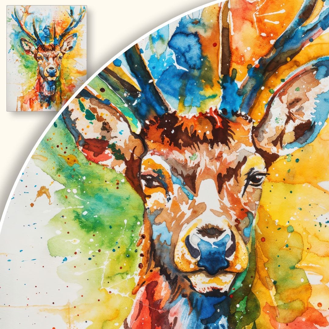 Motyw jelenia często pojawia się w różnych tradycjach artystycznych jako symbol siły, odnowy i duchowego przewodnictwa. W sztuce współczesnej artyści tacy jak Franz Marc czy Salvador Dalí eksperymentowali z przedstawieniami zwierząt w zaskakujących, ekspresyjnych formach. Połączenie abstrakcji z techniką akwareli nawiązuje do nowoczesnych trendów, gdzie natura spotyka się z kreatywną swobodą wyrazu.