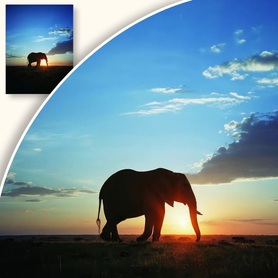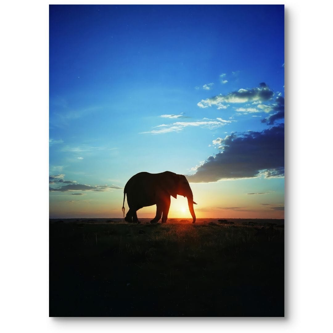 Kompozycja została starannie przemyślana – słoń umieszczony centralnie skupia uwagę widza, a panorama nieba i ziemi buduje harmonię. Ciepłe promienie zachodzącego słońca otulają postać zwierzęcia delikatnym światłem oraz podkreślają intensywne kontrasty barw: głęboki błękit przechodzi płynnie w pomarańcz, tworząc uspokajającą i naturalną atmosferę.