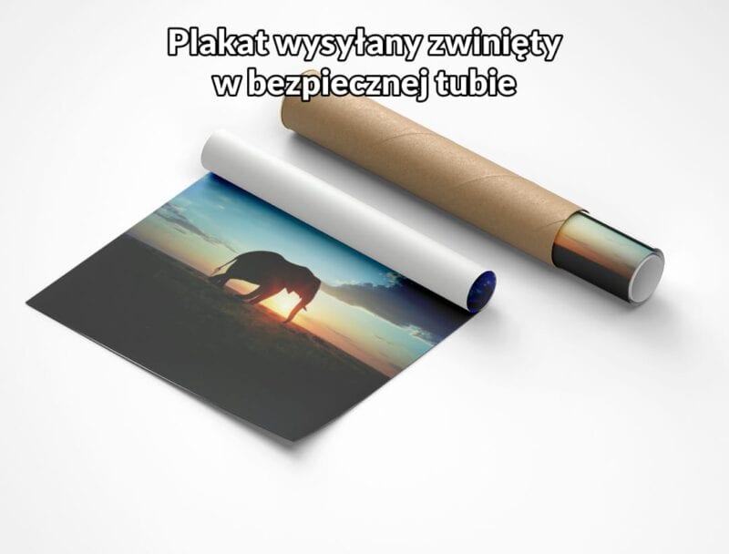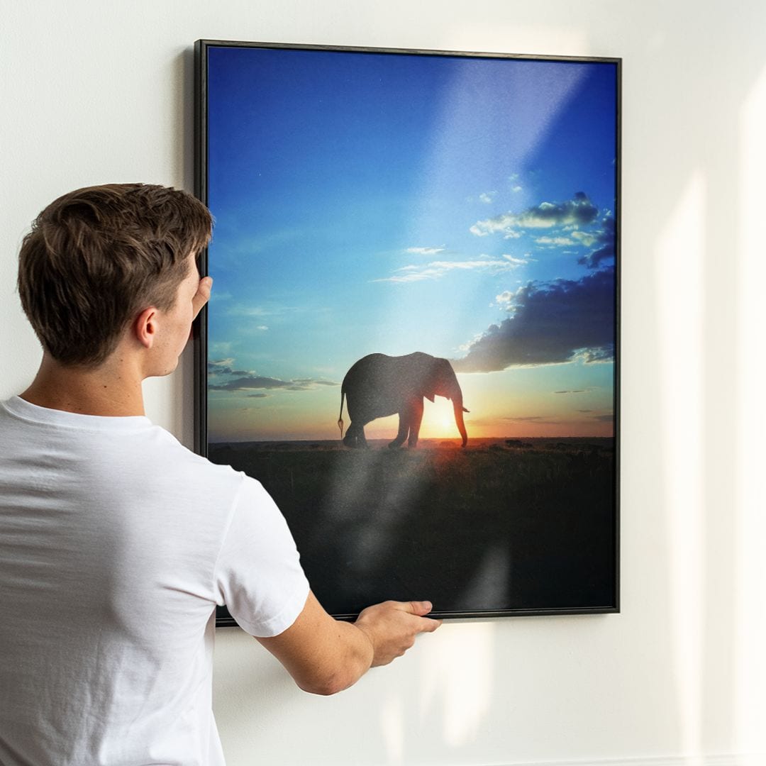 Plakat emanuje spokojem i wyciszeniem. Słoń, jako symbol mądrości i siły, na tle zachodzącego słońca, staje się metaforą harmonii, refleksji i szacunku dla natury. To idealna dekoracja dla osób poszukujących kontaktu z dziką przyrodą w domowym zaciszu.