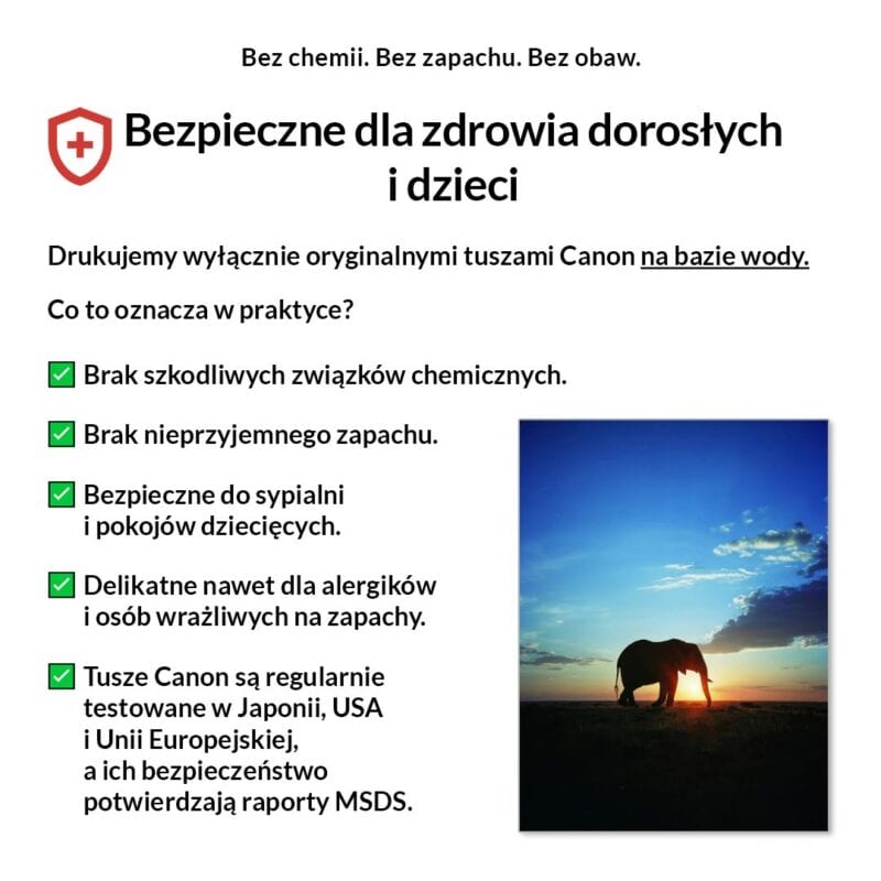 My drukujemy wyłącznie na pigmentowych tuszach Canon LUCIA PRO, bezpiecznych, bezzapachowych i certyfikowanych.