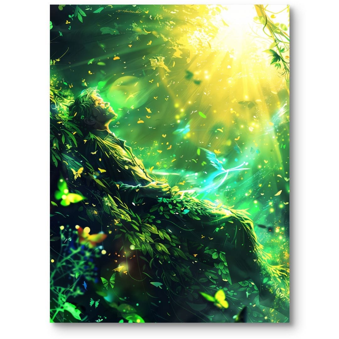 Ten niezwykły plakat przedstawia postać człowieka zatopionego w harmonii otaczającego go lasu. Buja zieleń liści, ulotne motyle oraz subtelne wzory świetlne budują magiczną, niemal baśniową atmosferę, w której wyciszenie i spokój spotykają się z tajemniczością natury.