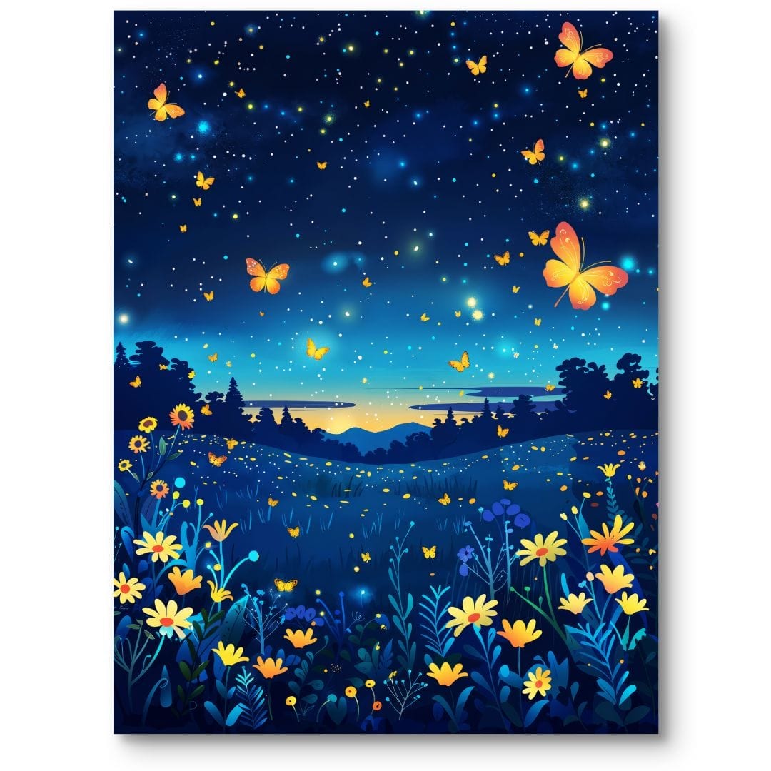 Plakat przenosi widza w niezwykły, magiczny krajobraz nocy, gdzie bujne łany kwiatów pulsują barwami, a świetliste motyle unoszą się nad ziemią. Rozgwieżdżone niebo w głębokich odcieniach granatu kontrastuje z żółtymi i pomarańczowymi skrzydłami motyli, tworząc wyjątkowo marzycielski nastrój. Tło z dyskretnymi sylwetkami drzew i pagórków pogłębia kompozycję i zachęca do zanurzenia się w tej onirycznej scenerii.