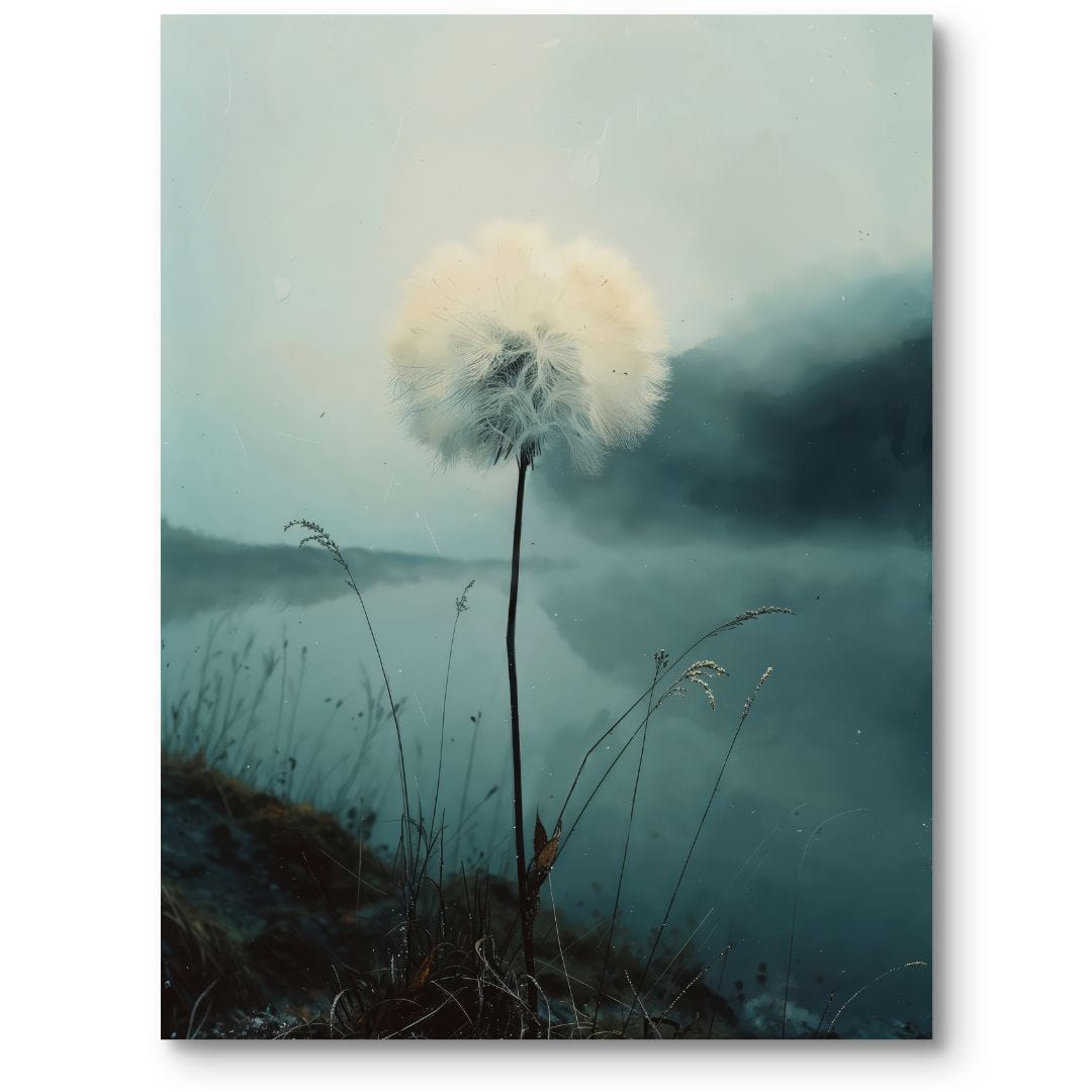 Minimalistyczna kompozycja przyciąga wzrok swoją spójnością i harmonią. Zwiewny dmuchawiec kontrastuje z chłodnymi, jasnymi barwami jeziora i nieba, tworząc łagodny, relaksujący klimat. Delikatne światło dopełnia całości, nadając plakatowi kojącego i wyciszającego charakteru.