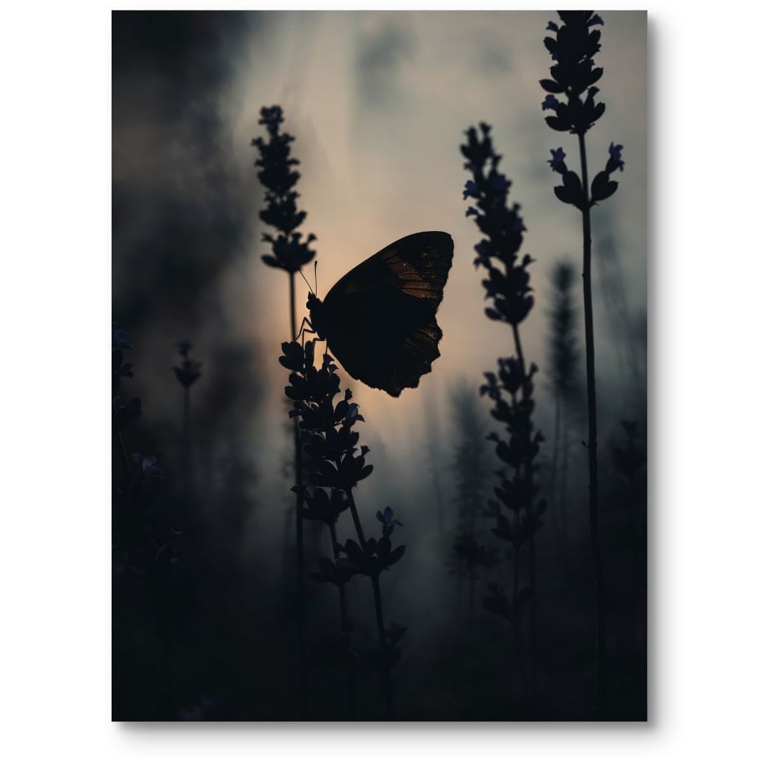 Plakat ukazuje olśniewający widok motyla subtelnie spoczywającego na delikatnych kwiatach. Ta wyjątkowa scena zachwyca wyrazistym kontrastem między głębokim, ciemnym tłem a eterycznym pięknem motyla i roślin. Motyw przewodni to natura w swojej najczystszej, najbardziej kruchej postaci — z motylem, który staje się jej symbolem ulotności i gracji.