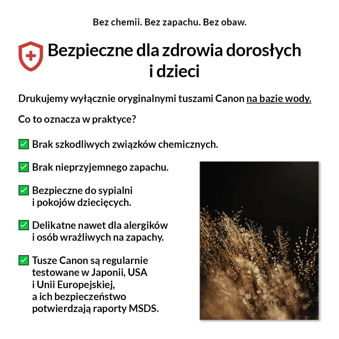 My drukujemy wyłącznie na pigmentowych tuszach Canon LUCIA PRO, bezpiecznych, bezzapachowych i certyfikowanych.