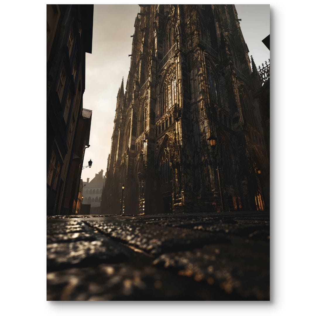 Wyjątkowy plakat ukazuje monumentalność gotyckiej katedry, której misternie zdobiona architektura dominuje nad miejskim pejzażem. Złote światło podkreśla każdy detal fasady, roztaczając aurę tajemniczości i niepowtarzalnego piękna. Potęga gotyckich łuków oraz kunszt ornamentów oczarują każdego pasjonata architektury i historii.