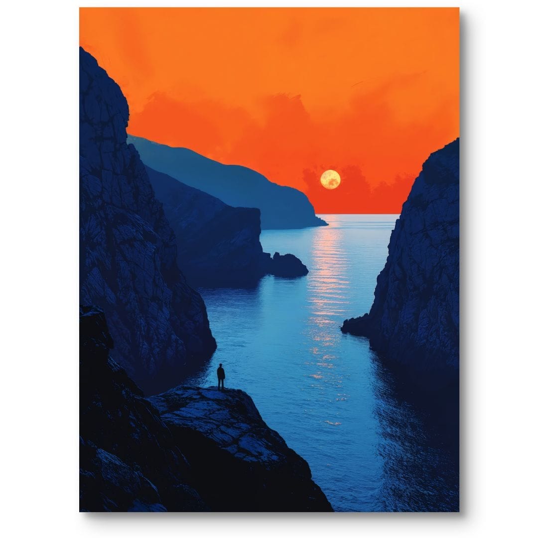 Ten plakat przenosi nas w niezwykle malowniczy krajobraz: wyspa otulona promieniami zachodzącego słońca wyłania się na tle spokojnego jeziora, otoczonego majestatycznymi górami. W centrum tej scenerii pojawia się postać samotnego człowieka, który w ciszy przygląda się pięknu natury, nadając całości refleksyjny i kontemplacyjny charakter.