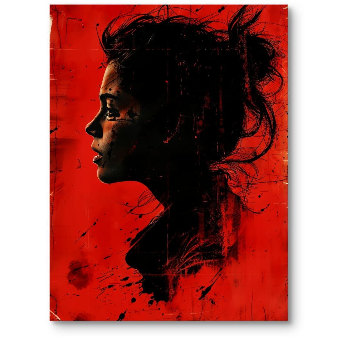 Plakat portretuje profil kobiety na intensywnie czerwonym tle, przyciągając wzrok wyrazistymi kontrastami. Ciemne, prawie czarne kontury twarzy i włosów zderzają się z mocną czerwienią tła, tworząc intrygującą, ekspresyjną kompozycję. Obraz ten budzi silne emocje dzięki dramatycznej grze barw i tajemniczemu charakterowi.