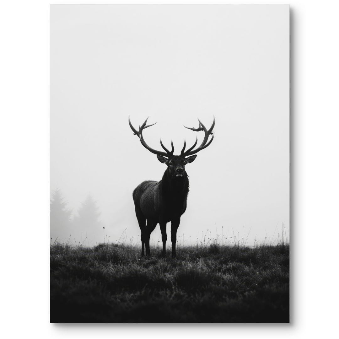 Plakat przedstawia majestatycznego jelenia uchwyconego w naturalnym środowisku. Wykonany w czarno-białej tonacji, zachwyca ponadczasową elegancją i subtelnym wyczuciem stylu. Realistyczne odwzorowanie zwierzęcia podkreśla jego dostojność i spokój, zapraszając do zatrzymania się na chwilę refleksji.