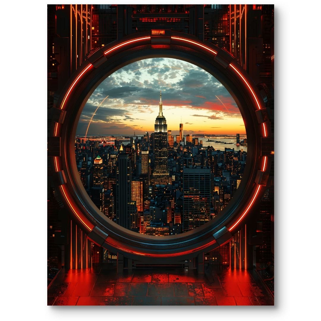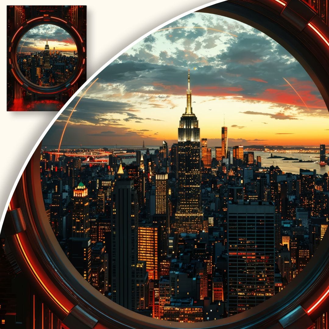 Kompozycja opiera się na centralnie umieszczonym oknie, stanowiącym naturalną ramę dla panoramy Nowego Jorku. W centrum uwagi znajdziemy Empire State Building dumnie górujący ponad miejską dżunglą. Paleta barw opiera się na wyrazistych czerniach, pomarańczach i czerwieniach, co buduje dynamiczną, a jednocześnie tajemniczą atmosferę. Zachodzące słońce wprowadza do kadru ciepłe refleksy, pięknie kontrastujące z chłodem wielkomiejskiej architektury.