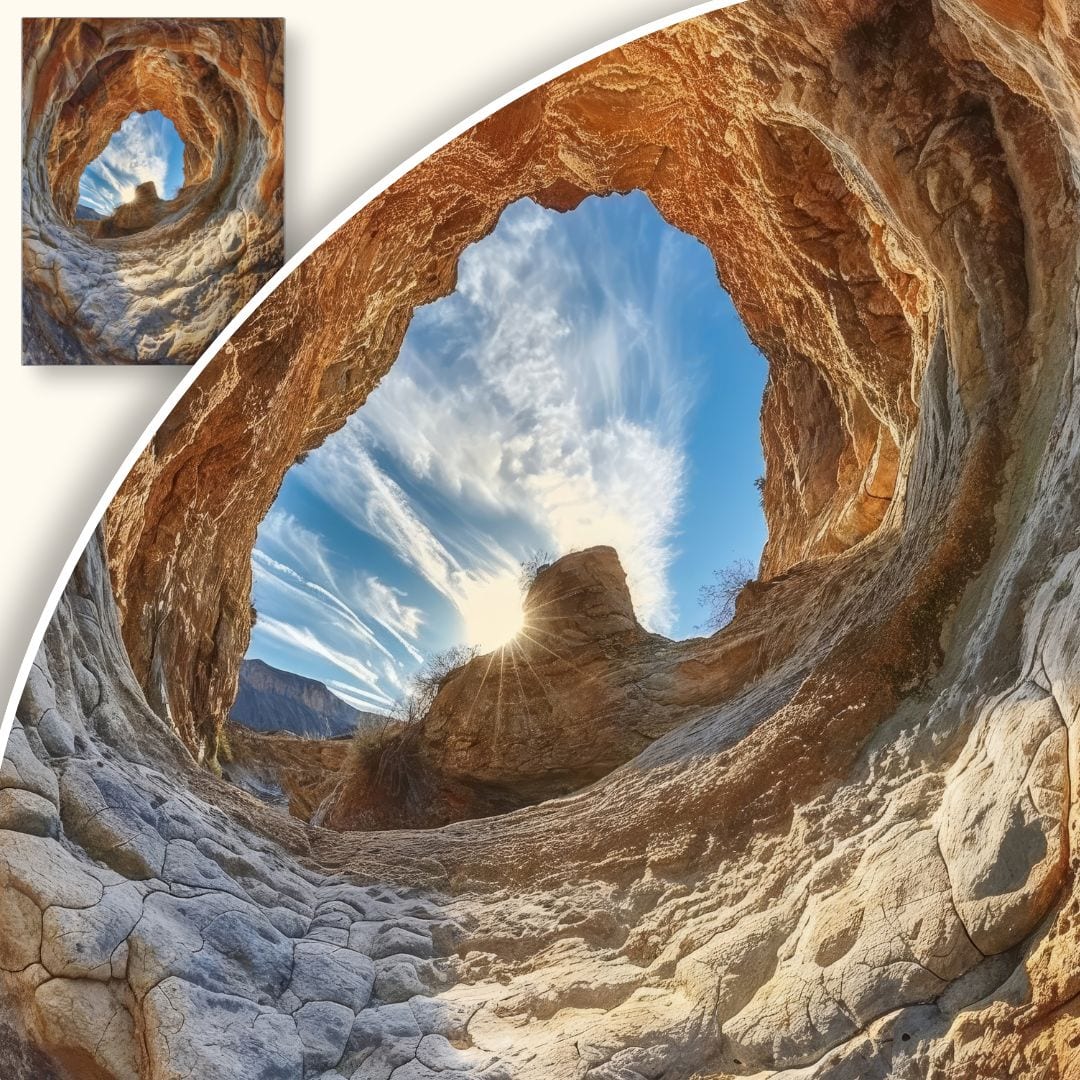 Ten plakat przenosi nas w serce dzikiej przyrody, prezentując zachwycający widok z wnętrza jaskini na rozświetlony naturalnym światłem świat zewnętrzny. Uwagę zwracają wyraziste formacje skalne w odcieniach brązu i pomarańczu, które znakomicie kontrastują z błękitnym niebem, tworząc wyjątkowo malowniczy i inspirujący pejzaż. To doskonała ilustracja piękna i tajemniczości natury.