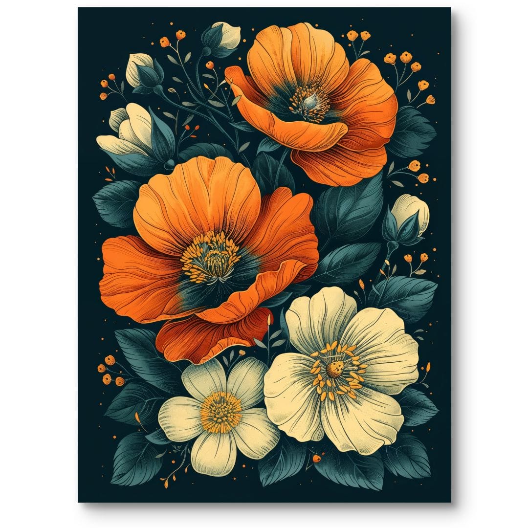 Ten plakat to wyrafinowana kompozycja, która ukazuje urzekające piękno maków w odcieniach pomarańczowego oraz delikatnej bieli. Na tle starannie odwzorowanych liści i subtelnych gałązek, kwiaty stają się centralnym punktem całego projektu, przyciągając wzrok i wprowadzając do wnętrza atmosferę świeżości oraz radosnej harmonii.