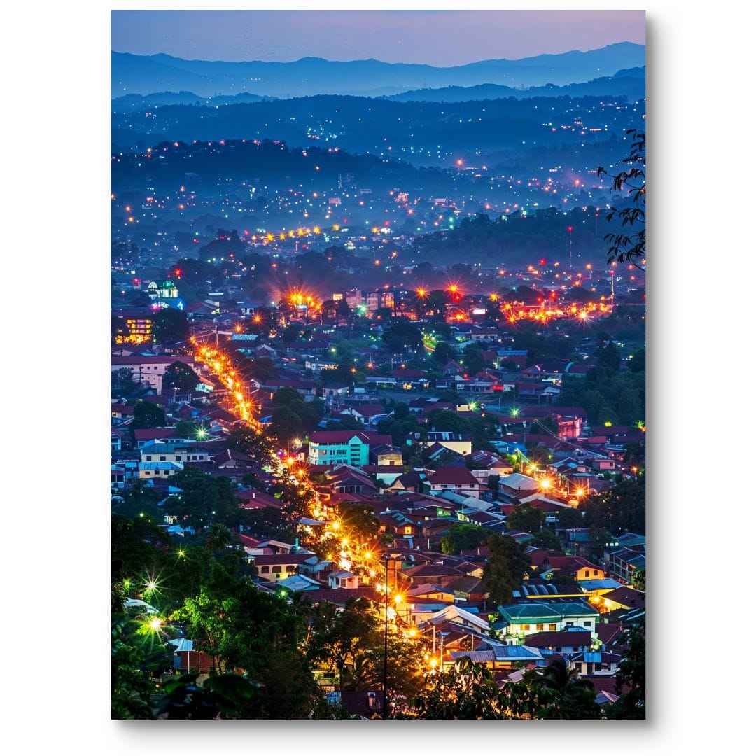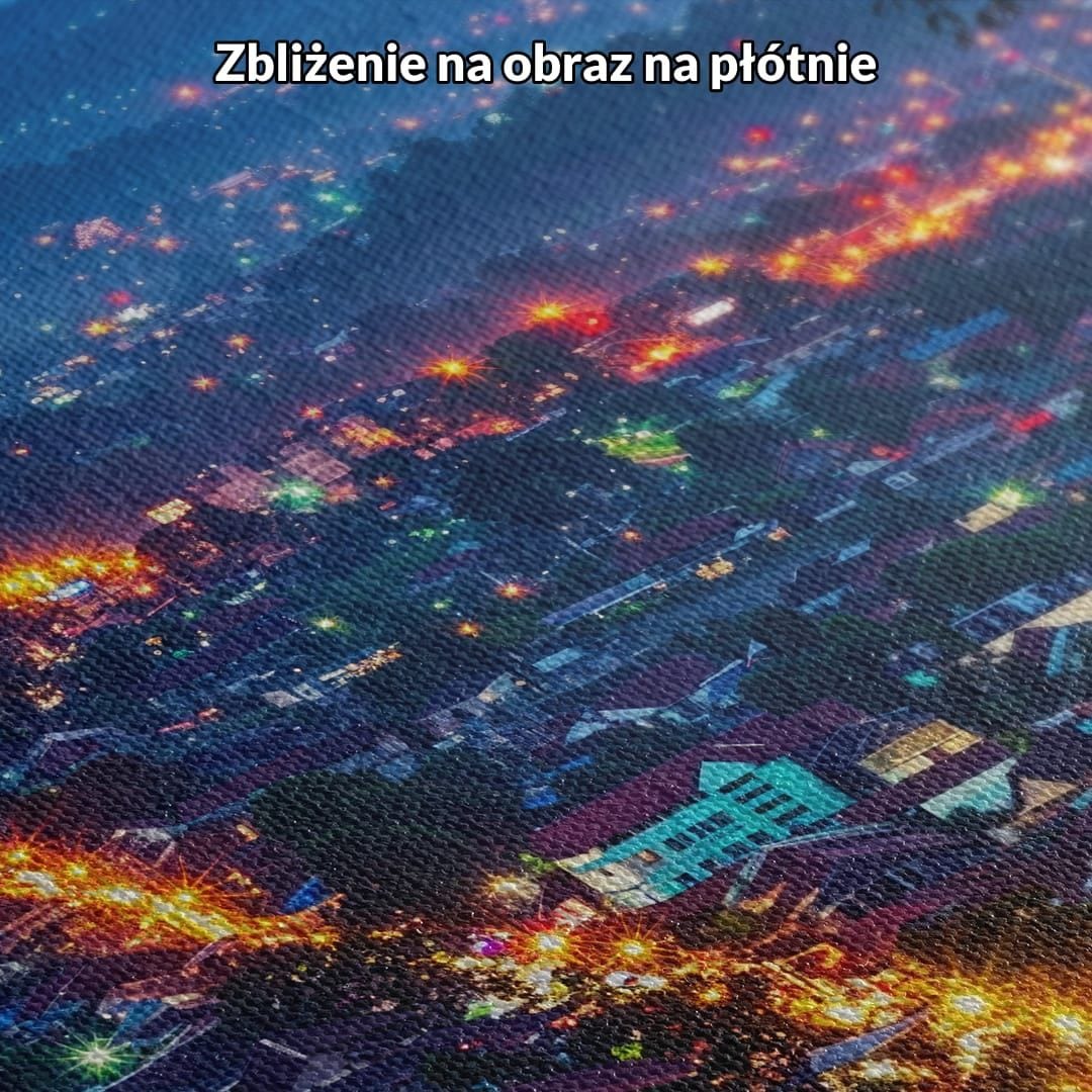 Wyważona kompozycja skupia uwagę widza na geometrycznych liniach ulic oraz świetlistych punktach, prowadząc wzrok w głąb miejskiego pejzażu. Zimne błękity nocnego nieba kontrastują z ciepłymi pomarańczami latarni i świateł, zapewniając harmonijną, nowoczesną całość.