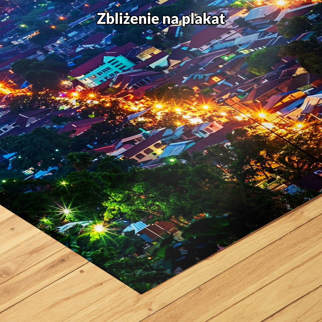 - Fotograficzny plakat prezentujący nocny pejzaż miasta