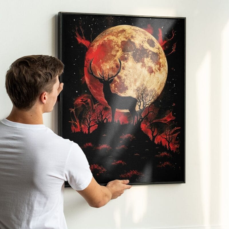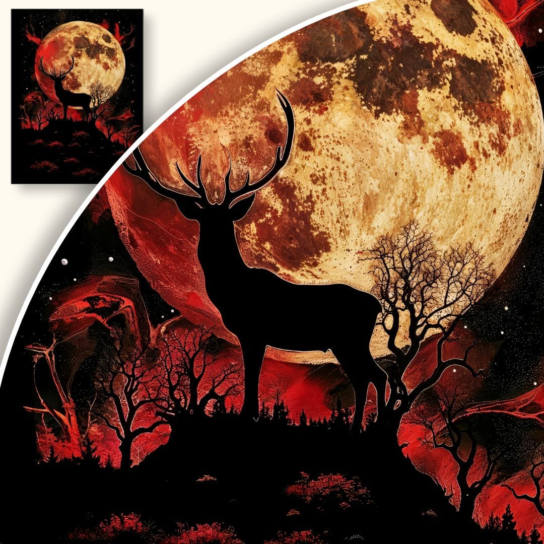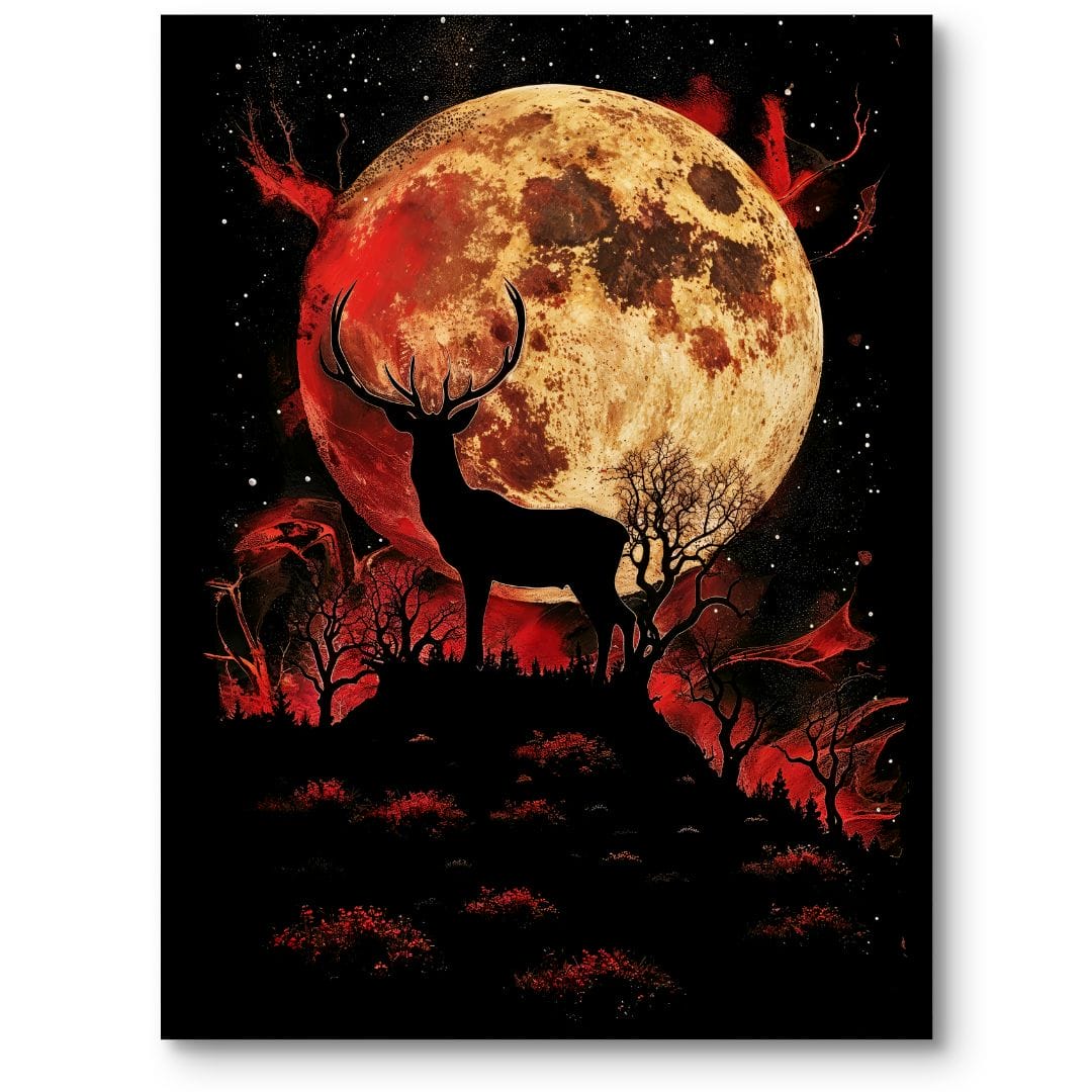 Plakat przedstawia majestatycznego jelenia dumnie stojącego na skalistym wzniesieniu, na tle imponującego, pełnego księżyca. Wokół rozciąga się tajemniczy, czerwony krajobraz nocny, gęsto porośnięty drzewami i krzewami. Artystyczne połączenie realizmu i surrealizmu sprawia, że całość przypomina scenę wyjętą z baśni lub onirycznego marzenia. Motyw jelenia niesie ze sobą symbolikę siły, spokoju i naturalnego piękna, podczas gdy blask księżyca dodaje kompozycji głębi oraz nuty tajemnicy.