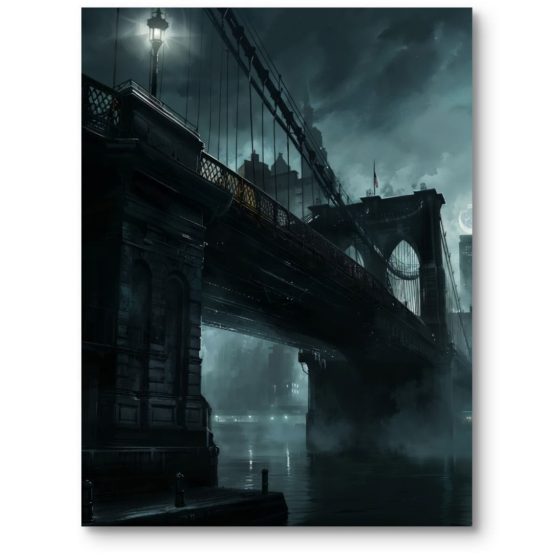 Dynamiczna kompozycja skupia się na majestatycznych detalach Mostu Brooklińskiego, umiejętnie wykorzystując światło latarni i refleksy na wodzie do stworzenia efektownego kontrastu z ciemnym tłem. Dominują chłodne, głębokie barwy, które wzmacniają nocny, enigmatyczny klimat widoku.