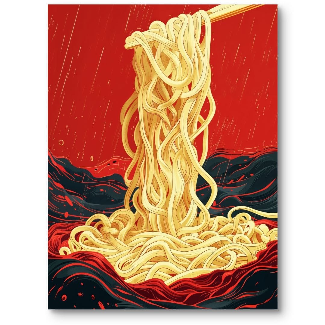 Plakat ten przedstawia niezwykle dynamiczną, ekspresyjną scenę z makaronem w roli głównej. Przerysowane, jaskrawo żółte nitki makaronu sprawiają wrażenie tańczących, ożywionych postaci, unoszących się na tle intensywnej czerwieni i głębokiej czerni. To nietuzinkowe ujęcie kulinarnego motywu nadaje makaronowi niemal kultowy charakter, przyciągając wzrok i pobudzając wyobraźnię miłośników oryginalnej sztuki na ścianę.
