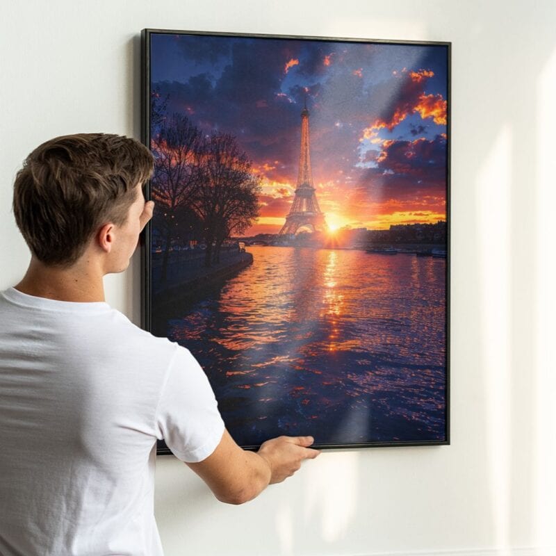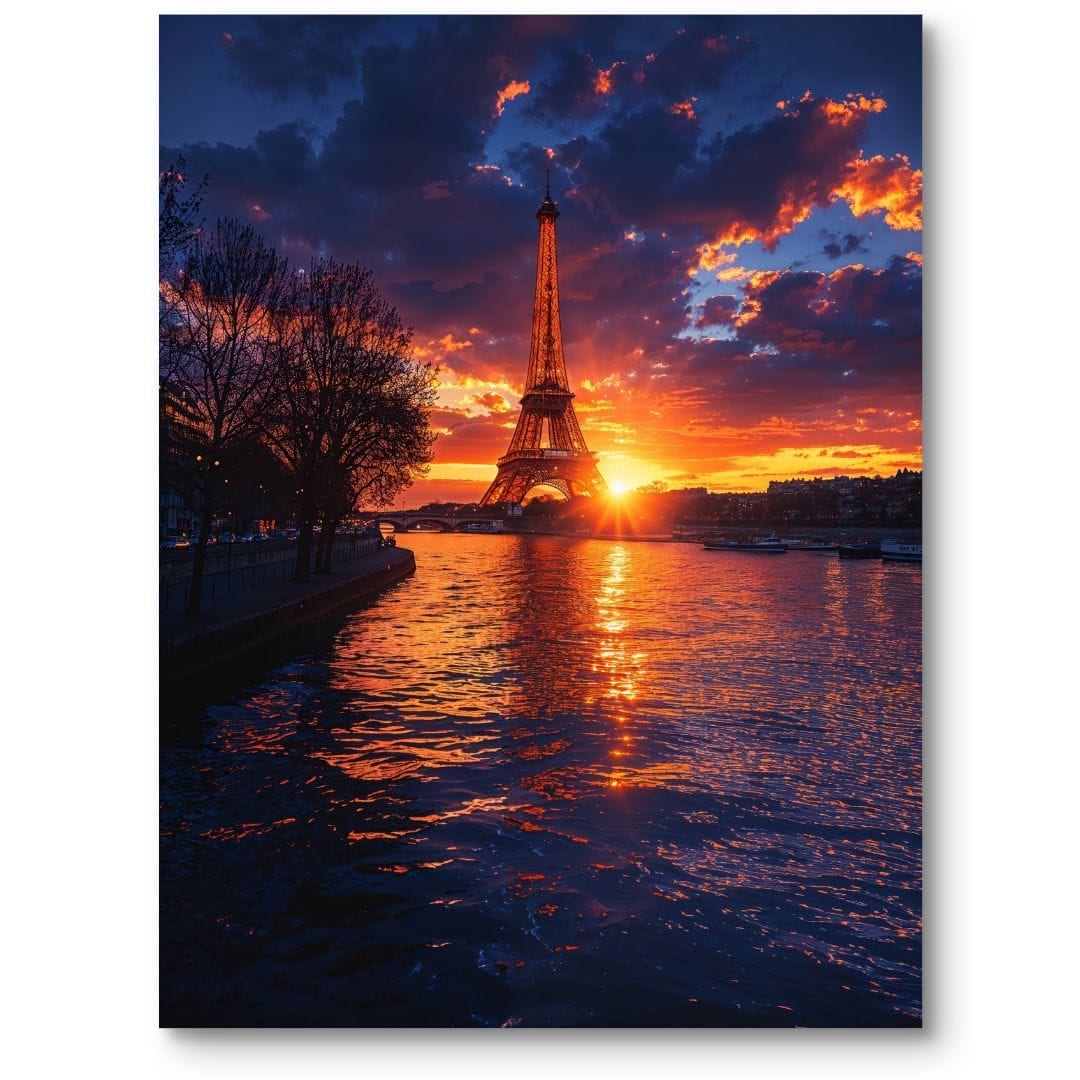 Plakat ukazuje spektakularny zachód słońca nad Paryżem z majestatyczną wieżą Eiffla na pierwszym planie. Scena została uchwycona z perspektywy nadbrzeża Sekwany, co wprowadza wyjątkową głębię oraz wyrazistą perspektywę. Ciepłe światło zachodzącego słońca maluje niebo w niesamowite odcienie, tworząc widok, który na długo zapada w pamięć i urzeka swoją atmosferą.