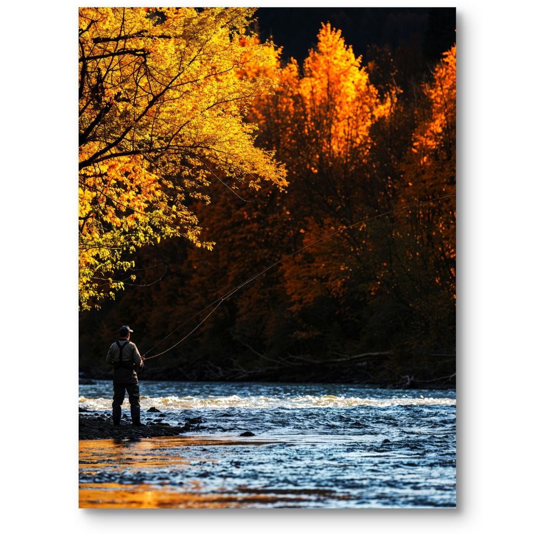 Plakat ukazuje urzekającą scenę jesieni nad rzeką, gdzie centralną postacią jest wędkarz oddający się swojej pasji pośród feerii intensywnie pomarańczowych i złocistych liści drzew. Bogactwo barw wprowadza do wnętrza ciepło i energię, a zarazem zaprasza do zatrzymania się na moment i zanurzenia się w spokojnej atmosferze natury. Plakat ten oddaje esencję relaksu, kontemplacji oraz harmonii między człowiekiem a otaczającym go światem przyrody.