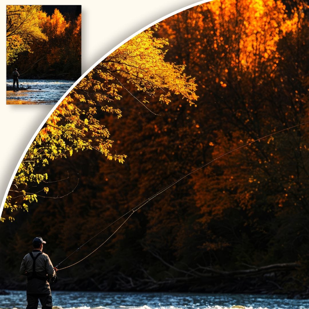 Zrównoważona kompozycja prowadzi wzrok ku wędkarzowi, który staje się centralnym punktem opowieści wizualnej. Ciepłe, pastelowe odcienie jesieni kontrastują z chłodną tonią rzeki, tworząc wyjątkową głębię i przestrzeń. Gra światła i cieni przenosi widza wprost do głębi pejzażu, podkreślając jego autentyczność i trójwymiarowość.
