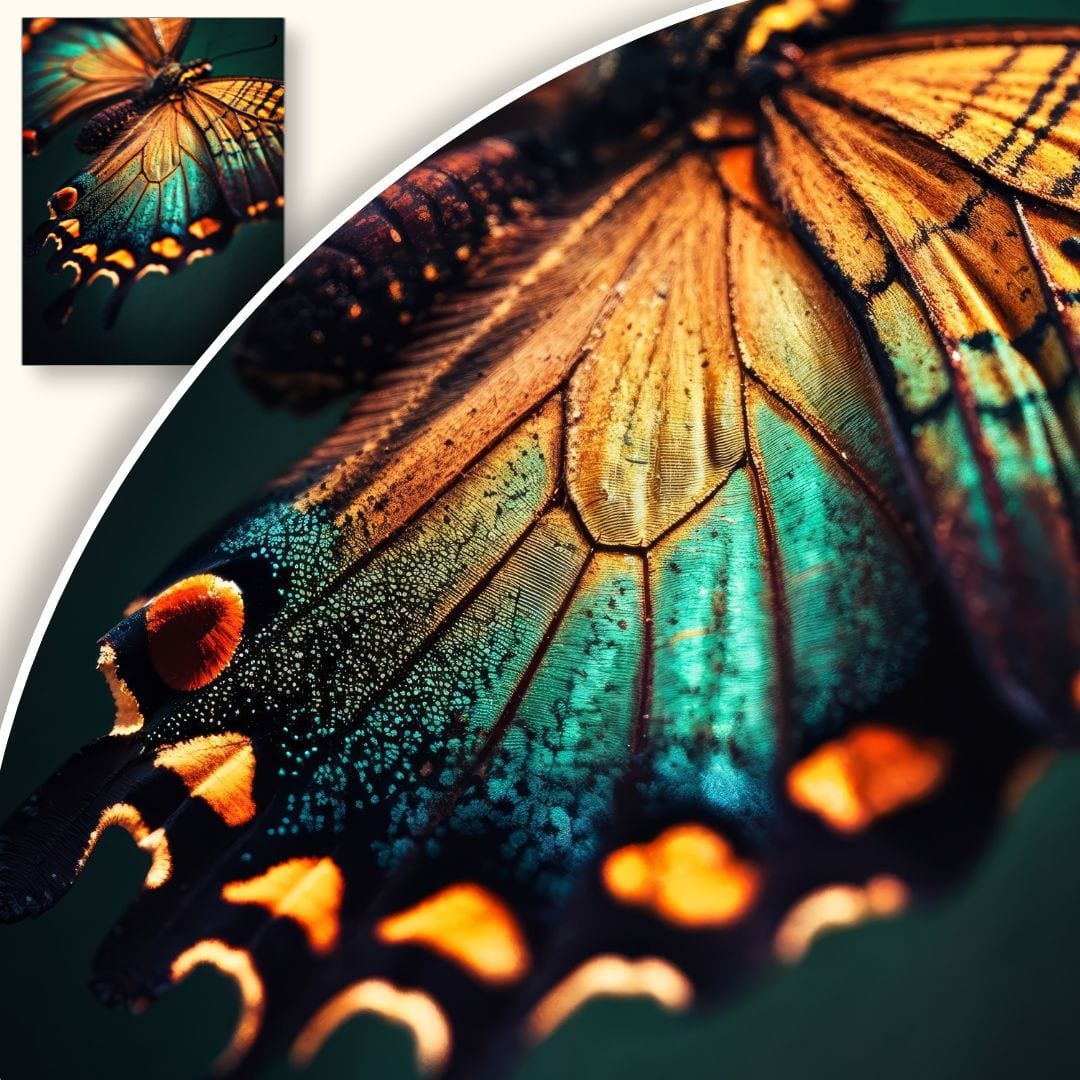 Prezentowany plakat jest wspaniałym przykładem fotografii makro, w której kluczowe znaczenie ma wychwycenie nawet najdrobniejszych szczegółów. Dzięki tej technice podziwiamy motyla w naturalnej okazałości z uwydatnionym bogactwem barw i faktur. Doskonała rozdzielczość zdjęcia wzmacnia wrażenie głębi i autentyczności, pozwalając cieszyć się każdym detalem.