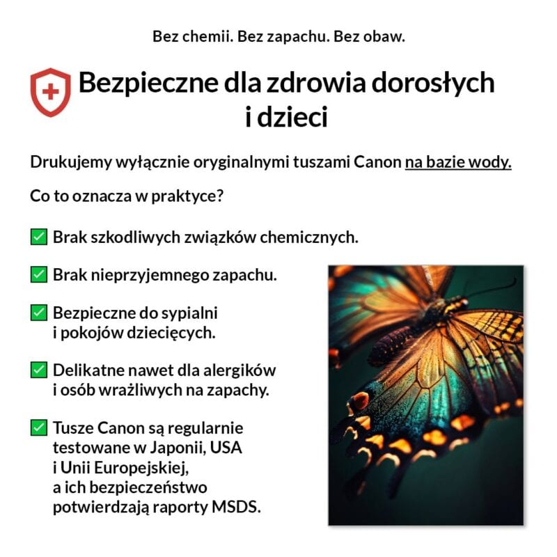 Tak, absolutnie! Drukujemy wyłącznie certyfikowanymi, bezwonnymi tuszami pigmentowymi Canon Lucia Pro na bazie wody. Są one w pełni bezpieczne dla zdrowia, nie zawierają rozpuszczalników i mogą być bez obaw stosowane w sypialniach i pokojach dziecięcych.