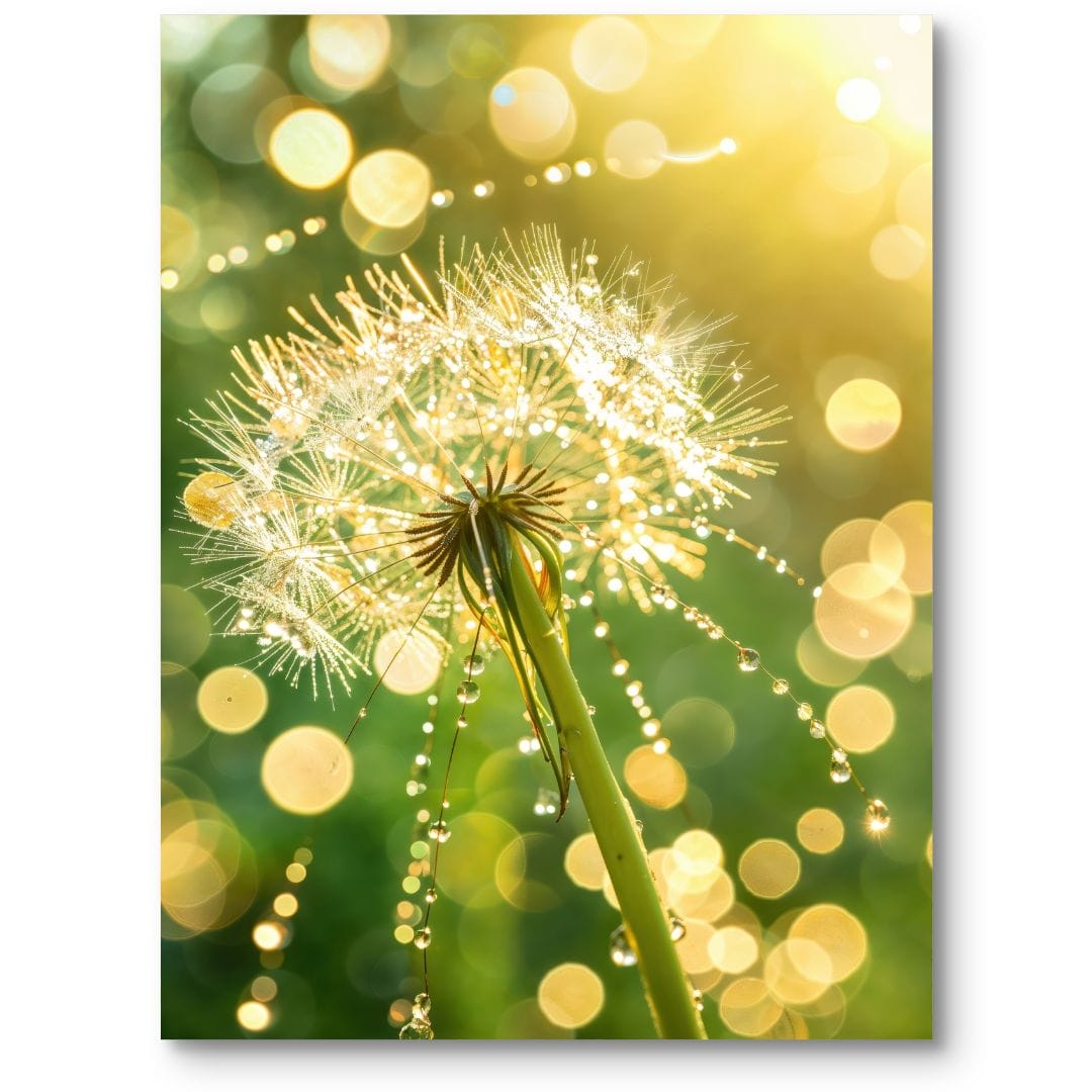 Ten wyjątkowy plakat prezentuje mniszka lekarskiego uchwyconego w makrofotografii, odkrywając przed nami niezwykłą delikatność i szczegółowość jego parasolek skropionych kroplami rosy. W tle rozpościerają się rozmyte, zielone liście zatopione w ciepłym, żółtawym blasku słonecznym, co nadaje całości niepowtarzalnego uroku i świeżości.