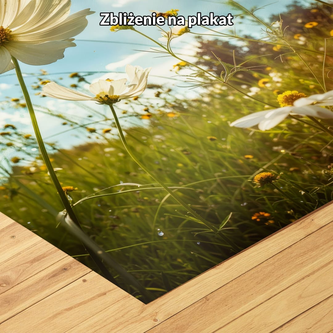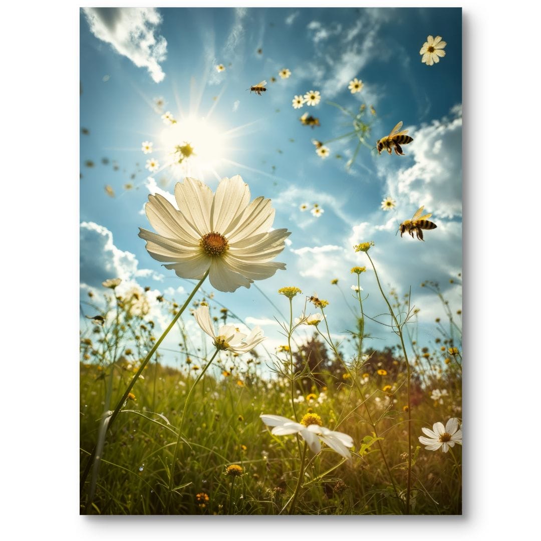 Kompozycja plakatu przyciąga wzrok dynamicznym układem – wyraźnie wyeksponowanym kwiatem i pszczołami w ruchu. Ciepłe światło słoneczne maluje scenę, wydobywając głębię barw: od intensywnej zieleni traw, przez subtelną biel, aż po błękit nieba.