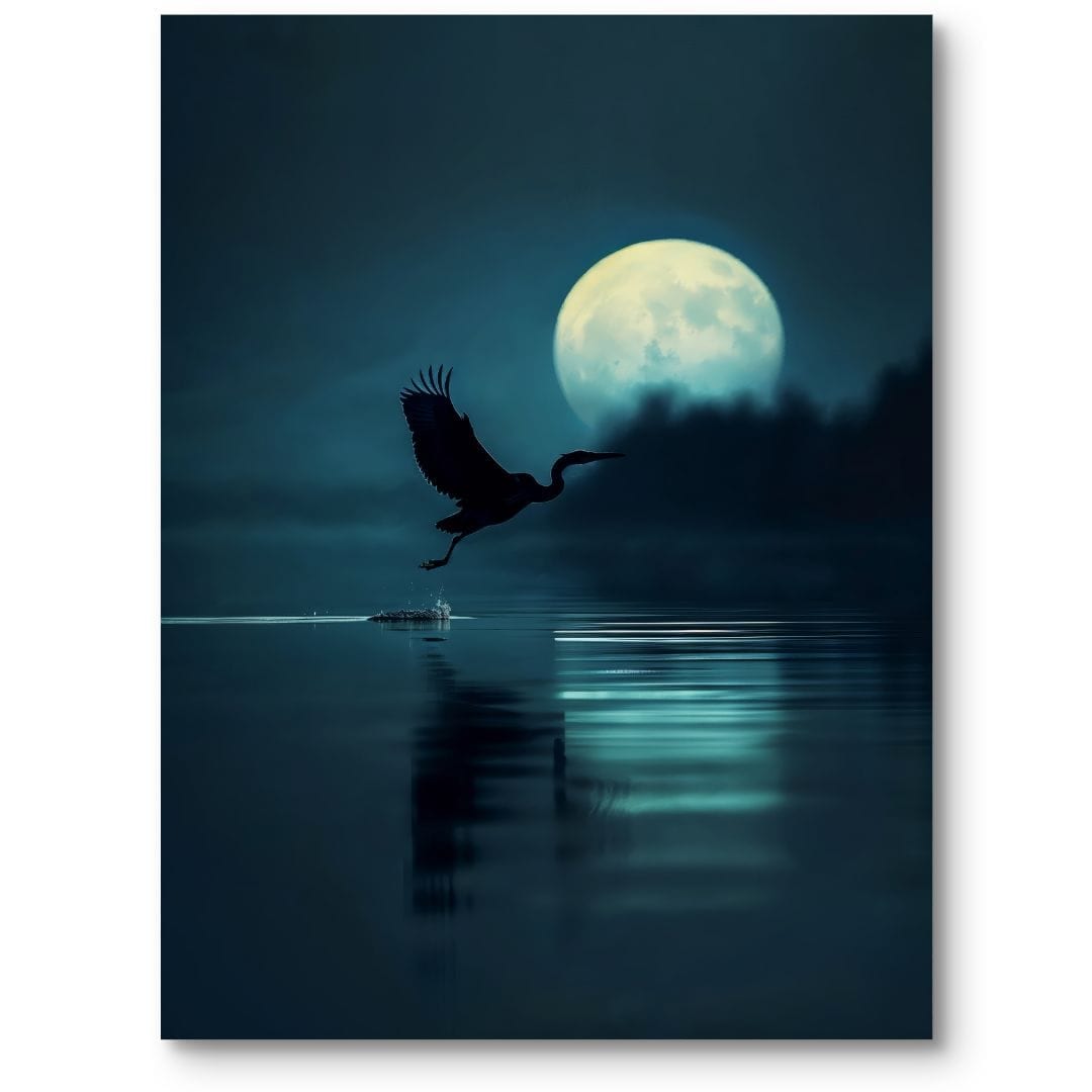Ten plakat ukazuje spokojny, a jednocześnie pełen tajemnicy nocny pejzaż – główną rolę odgrywa czapla majestatycznie lecąca na tle okazałego, pełnego księżyca. Ptak unosi się nad gładką taflą wody, na której odbija się blask księżyca, tworząc magiczną, hipnotyzującą scenerię. To niezwykłe spojrzenie na przyrodę wywołuje poczucie harmonii i skłania do refleksji.