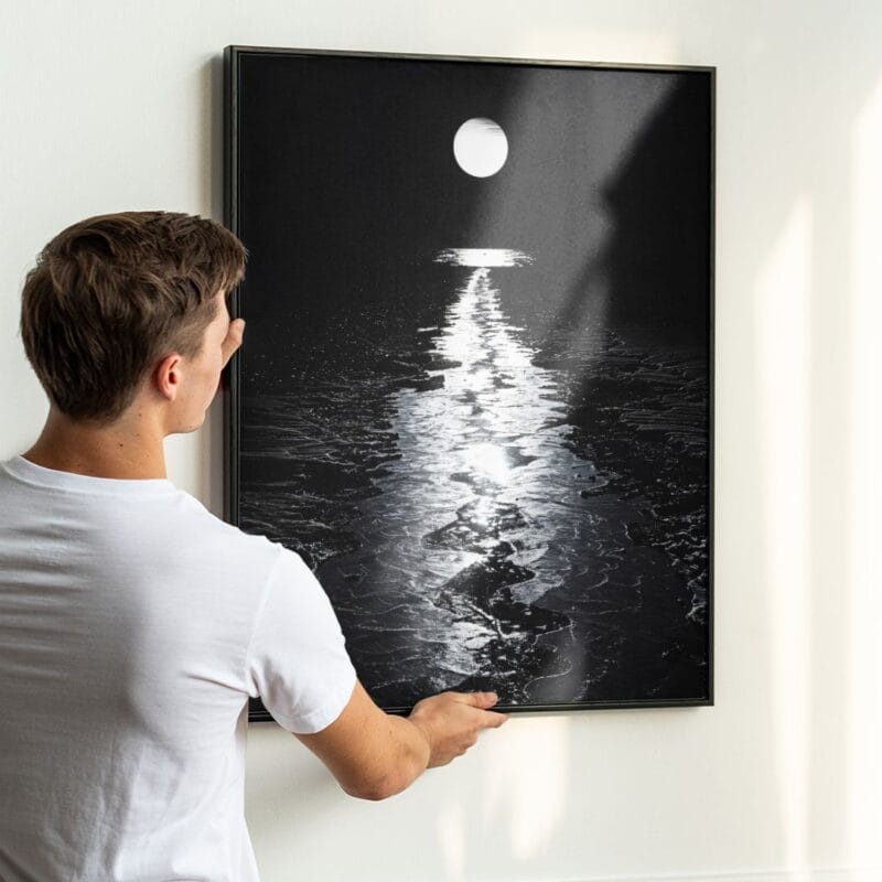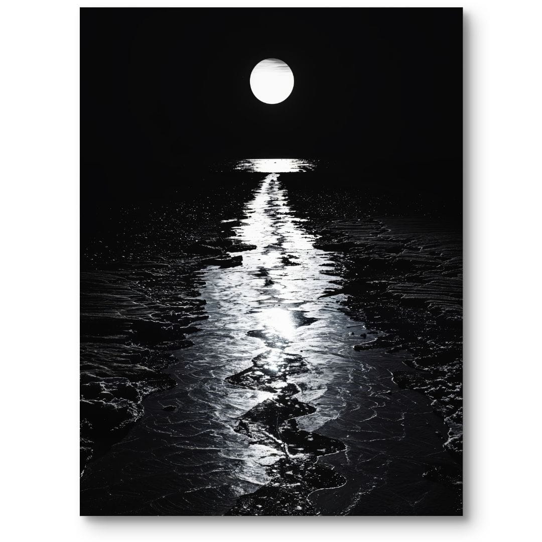 Plakat przedstawia tajemniczy, pełen głębi krajobraz nocny, w którym wyjątkową rolę odgrywa świetlista ścieżka odbijającego się w wodzie księżyca. Centralnym elementem kompozycji jest lśniący, pełny księżyc górujący wysoko na niebie, którego blask subtelnie prowadzi wzrok widza aż do serca ujęcia. Spokojne, bezludne otoczenie potęguje atmosferę samotności i zagadkowości, sprawiając, że plakat wprowadza w świat cichej kontemplacji. To idealna propozycja dla pasjonatów nocnych pejzaży i miłośników surowego piękna natury.
