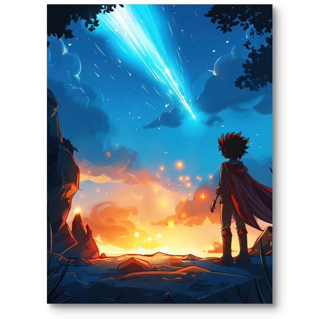 Plakat ukazuje niezwykłą, nocną scenę, w której młody chłopiec z zachwytem obserwuje spadającą gwiazdę. Baśniowe otoczenie, rozświetlone tysiącem iskier i osadzone pomiędzy tajemniczymi skałami, przenosi wyobraźnię do magicznego świata, gdzie wszystko jest możliwe. Ta ilustracja nie tylko zaprasza do snucia marzeń, lecz także inspiruje do poszukiwania nowych przygód i odkrywania nieznanych lądów.